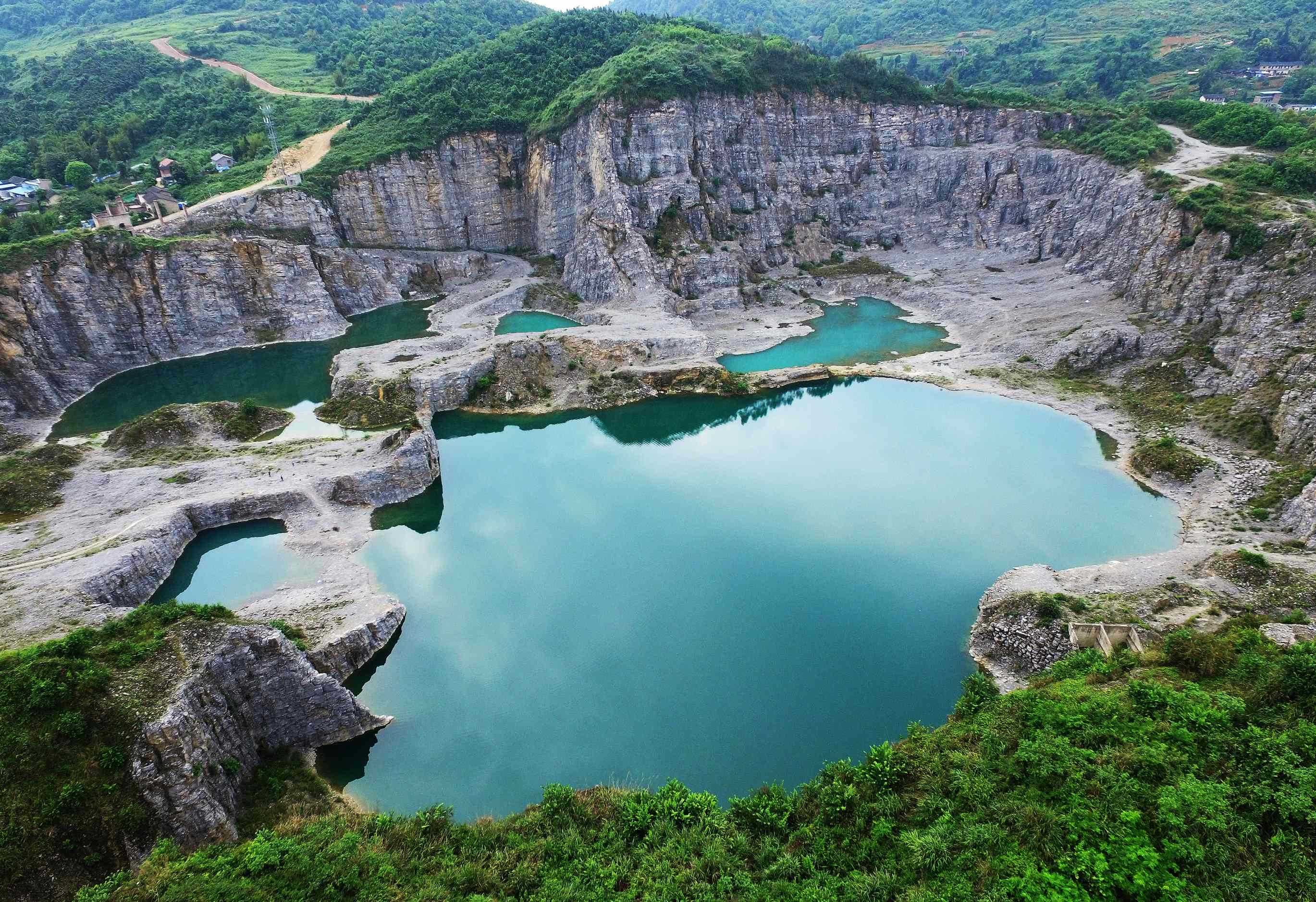 重庆渝北铜锣山国家矿山公园位于渝北区东北部石船镇,公园面积24.15km2,矿坑41个,平面总面积约2.47平方公里,南北绵延10公里。矿坑内湖水终年碧蓝澄澈,明丽见底,并且随着光照变化、季节推移,呈现不同的色调与水韵,在国内同类矿山中具有极高的稀有性,属世界少有或国内罕见的遗迹,具有较高的科普和观赏价值。矿坑水体颜色的光学基础来自其岩溶地质背景和良好的生态环境,在此基础上产生光线的选择吸收。由于水体清澈,光线入射深度较大,水体对蓝、绿光之外的其他色光产生了强烈的选择性吸收,故形成了独特的水体颜色的光学基础,辅以其他因素如钙华、藻类底质等形成绚丽的光彩。